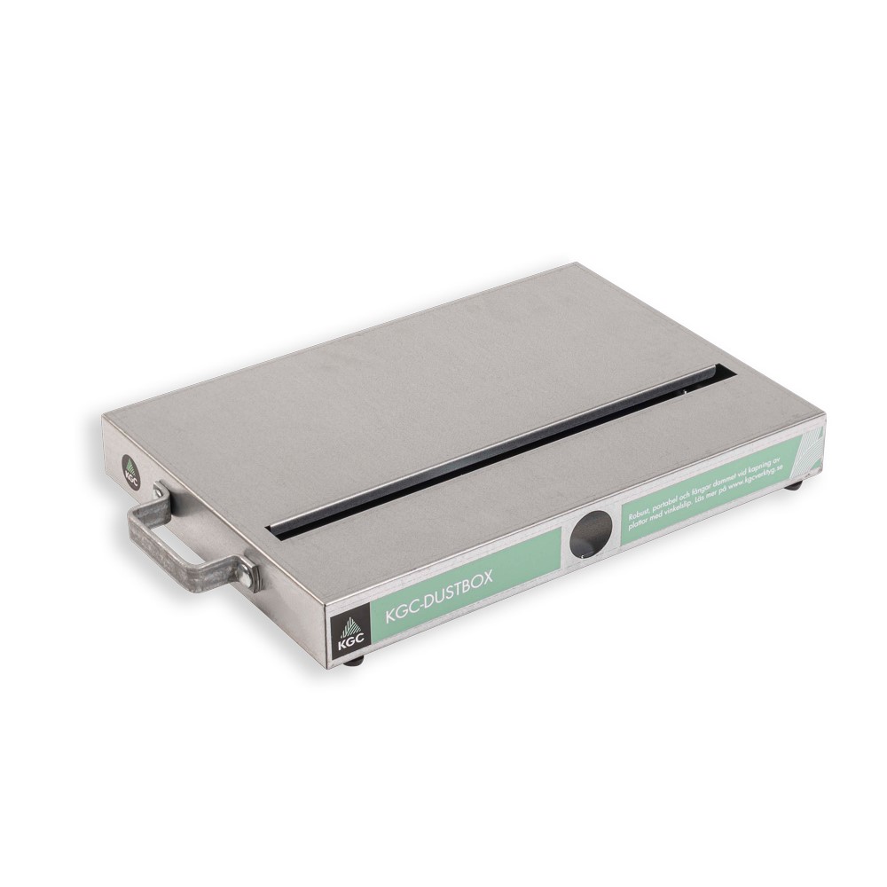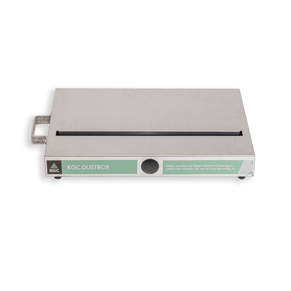 KGC Dustbox i robust plåt, fångar det mesta av dammet vid kapning av plattor med vinkelslip. Bra vid användning t.ex. inomhus då dammspridning skall minimeras. Skall kopplas till en dammsugare. Står stadigt på gummifötter. Enkel att transportera.