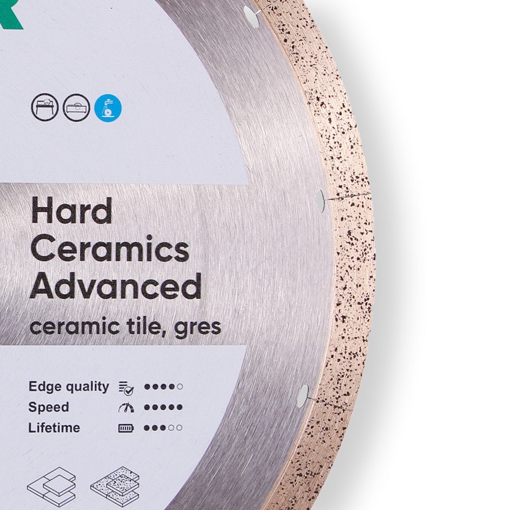 Keramik av tjocklek mer än 20 mm blir mer och mer populär eftersom produktionsbolagen ständigt arbetar med att dess tjocklek ökar såväl som dess slitage och frostbeständighet. Så, inte varje diamantblad kommer att kunna bearbeta sådant material. Hard ceramics advanced är vårt nya blad speciellt skapat för skärning av tjock keramisk granit. Grafitflisor i sin metallbindning skapar en finporerad struktur och fungerar som ett hårt smörjmedel. Lasersegmentering av diamantskiktet minskar den termiska belastningen på bladet. Arbeta endast med vattenkylning.
