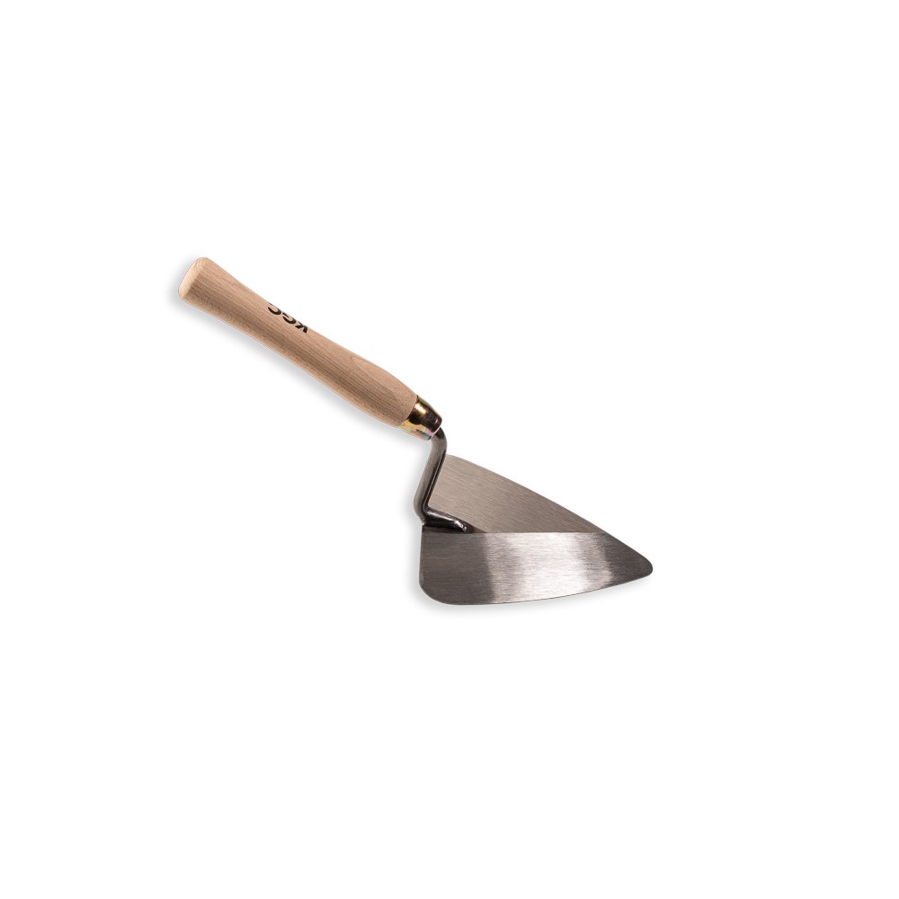 Trekantig, koniskt slipad slev med olackat trähandtag för bättre grepp.