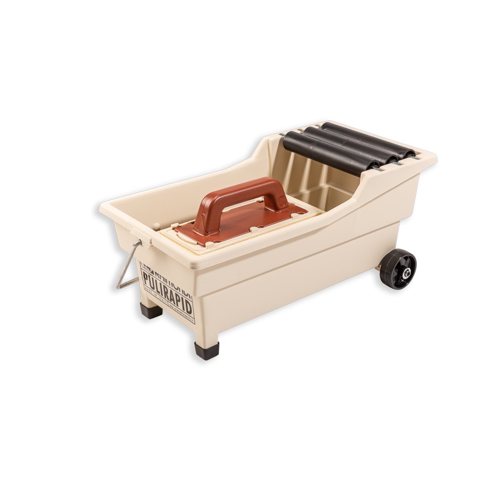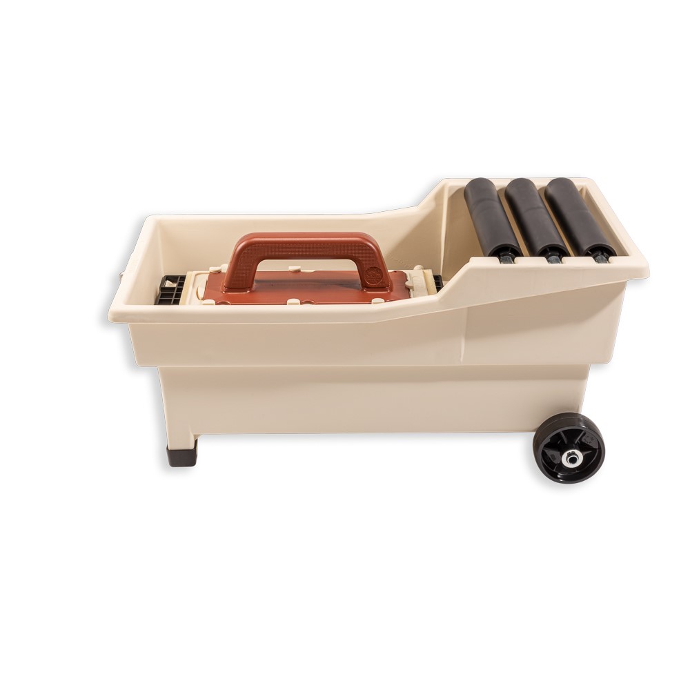 Kraftig balja med två hjul, galler samt urkramningsrullar i homogen plast och stålaxlar. Levereras inklusive svamp 7477.