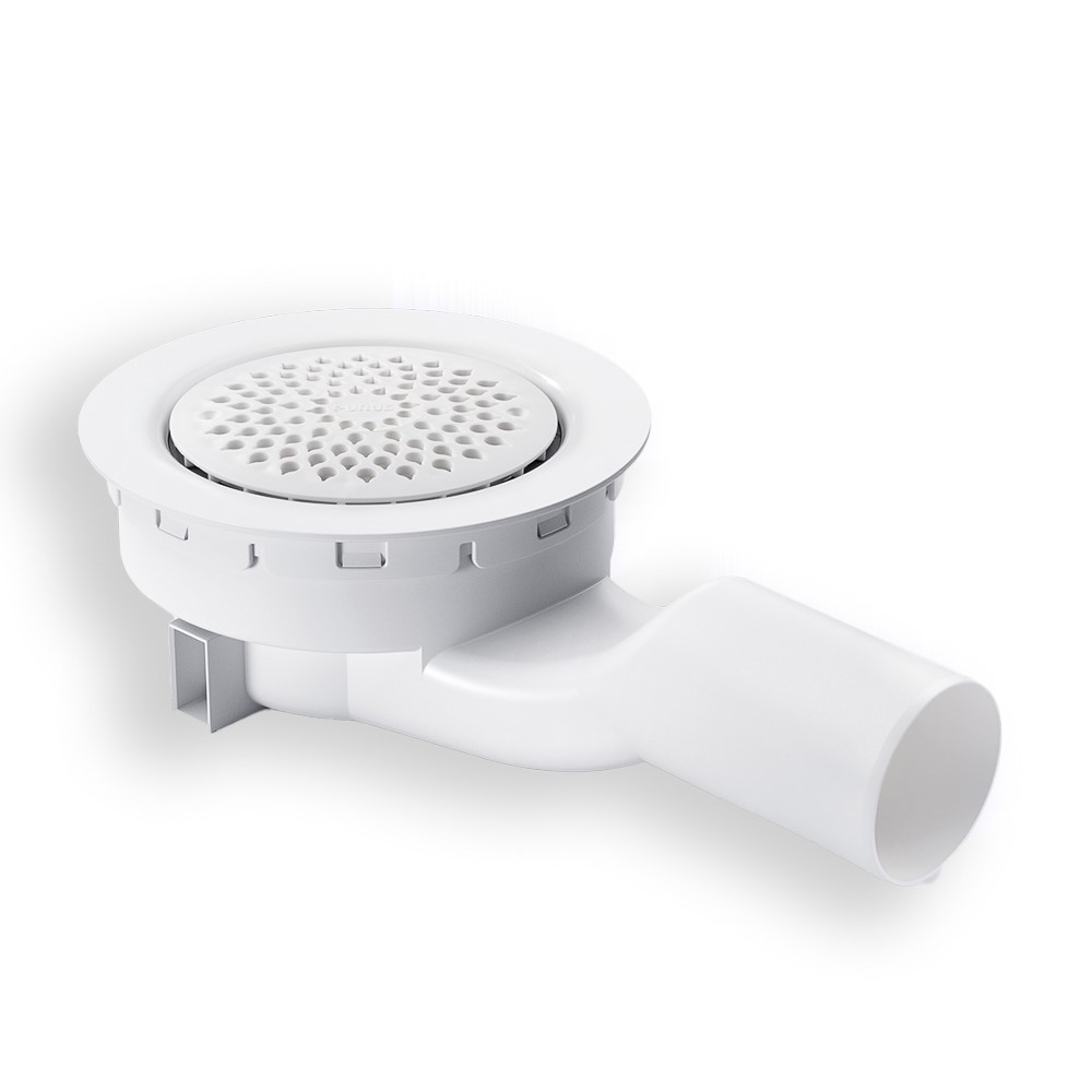 Golvbrunn Rot är den optimala lösningen för installation i betongbjälklag med dess låga bygghöjd på 99 mm och 75 mm sidoutlopp. Enkel att anpassa med justerbar fläns i höjdled, den kan höjdjusteras från 99 till 129 mm genom att vrida flänsen motsols (se till att detta görs före ingjutning).